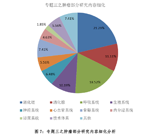 (三)专题三(疾病动物模型)细化分析1998 年至2018 年,上海市科技发展基金实验动物研究领域项目共资助343 项有关动物模型的研究,占总项目数的66.86%;特别是2008 年以后 “动物模型研究、开发和应用”专题的研究比例呈上升趋势,2012 年以后占年资助项目数的70%以上(图5)。细化分析发现,实验动物模型研究涉及现在医学的主要疾病,如肿瘤、神经系统、心血管系统、代谢、骨骼系统、生殖系统、消化系统、呼吸系统、泌尿系统等方面的疾病(图6),并以热门疾病(如肿瘤、神经系统和心血管系统)模型为重点资助对象,三者占该专题总项目数的52.76%,超过半数。肿瘤疾病模型根据发生部位(按资助的项目数从多到少,图7)又可细分为消化系统(消化道和消化腺)、呼吸系统、生殖系统、神经系统、骨骼系统、心血管系统、泌尿系统和内分泌系统等。