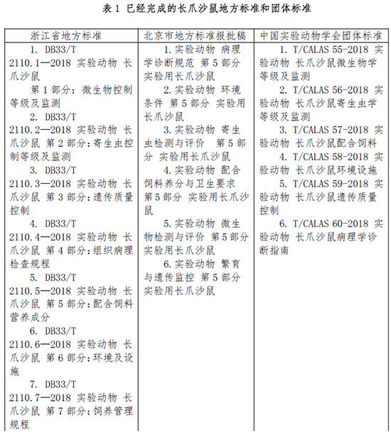 编者:资源增量是实验动物科技发展的核心任务,是实验动物对生命科学研究提供支撑和服务的基础和保障。自上世纪80年代以来,我国老一辈实验动物科学家苦心孤诣,在实验动物资源研发工作中取得了多项开创新成果。 1988年《实验动物管理条例》发布实施,在实验动物工作规范化、法制化管理,保障实验动物和动物实验的质量,推动我国科技发展和民生保障等方面发挥了重要作用。特别是在实验动物资源标准化、新品种/品系开发和动物模型创制方面,取得了令人瞩目的成果。 为此,借“科技资讯”之窗,陆续推出我国实验动物专家在此领域所作的工作及取得的应用成果。实验用沙鼠种群的建立与标准化长爪沙鼠(Meriones unguilatus或Mongolian gerbil),又名蒙古沙鼠或沙土鼠。野生长爪沙鼠主要分布在我国东北辽宁、西北内蒙宁夏等半干旱地区。实验用沙鼠种群都源自中国,1935年日本的C Kasuga博士在东北捕获20对进行驯化饲养,带回国后于1945年在日本实验动物资源研究所驯养,1954年由Victor Schwentker博士引入美国,之后传到欧洲各国,目前世界各地均有分布。我们国家的种群则分别由大连医科大学、首都医科大学、浙江省实验动物中心先后捕获、驯化和繁殖饲养,并进行了实验动物化和种群培育等研究工作。一、长爪沙鼠的主要生物学特性(一)外貌特征长爪沙鼠外形略似松鼠,大小介于大鼠和小鼠之间,成年体重50-113g,尾粗长,长满较硬被毛并在尾端集中形成毛簇。眼大而圆,耳明显,耳壳前缘有灰白色长毛,内侧顶端有少而短的毛。背毛棕灰杂色,体侧与颊部毛色较淡,腹部灰白色。后肢长而发达,约长27(24-30)mm,可作垂直与水平快速运动,易呈直立姿势。趾端有弯锥型长而有力的爪,后肢与掌部被以细毛[1]。(二)行为习性长爪沙鼠不冬眠,四季活动,喜囤积一定食物。性情较温顺,行动敏捷,有一定的攀跃能力。沙鼠是昼行性啮齿类动物,活动高峰在黎明后和黄昏前后[2]。长爪沙鼠易陷于催眠状态,常常发生类似人的自发性癫痫。长爪沙鼠在一定条件下会斗殴,成年沙鼠混群通常导致激烈斗殴,伴有损伤甚至死亡。(三)解剖特点长爪沙鼠牙齿尖利,可咬嚼木头。长爪沙鼠中腹部有一卵圆形棕褐色的无毛区,称为腹标记腺或腹标记垫,上面被有腊样物质,该腺在物体上磨擦时会分泌一种油状、具有怪味的分泌物,可作为其活动区域的标记。雄性沙鼠的腹标记腺较雌性沙鼠明显,且出现早,其标记行为和腺体的完整性受雄激素控制,其发育程度可作为雄鼠完全性成熟时日龄的估算依据。长爪沙鼠的眼球之后眼角内侧有副泪腺,此腺分泌一种吸引素,从鼻孔排出或与唾液混合,在动物清洁腹部时扩散出来。雄性沙鼠副泪腺分泌的吸引素对于动情期雌性沙鼠有促进交配的作用。沙鼠的肾上腺较大,与体重相比,其肾上腺几乎为大鼠肾上腺的3倍,其产生的皮质酮多。长爪沙鼠脑底动脉Willis环前后交通支存在不同程度的缺失,方便进行单侧结扎颈总动脉制作脑缺血模型[3]。(四)生理学特征长爪沙鼠正常体温38.1~38.4℃,呼吸频率90次/分,饲料消耗5~8 g/天/100g体重,饮水消耗7~9ml/天/100g体重,血量7.76ml/100g体重。野生长爪沙鼠在春季到秋季繁殖,驯养的长爪沙鼠为长年发情动物,春秋繁殖性能更好,每年12月和1月基本不繁殖。性成熟期为10~12周,性周期4~6天,交配多发生于傍晚和夜间,妊娠期为24~26天,哺乳期21天。成年雌鼠一年可繁殖3~4胎,多则达5~8胎,最高可繁殖14胎,一生的繁殖期为7~20个月。驯养动物的寿命为2~4年[4]。驯养的长爪沙鼠饲喂啮齿类动物的颗粒料就可以生长良好,繁殖性能不好时可添加鸡蛋和适量葵花籽、胡萝卜等[5]。(五)遗传特征长爪沙鼠有22对(44条)染色体,其中22条为正中着丝,10条亚中着丝,10条端着丝,1条较大的X染色体亚中着丝,还有1条较小的亚中着丝的Y染色体。迄今为止毛色突变共有11个群体,全部发生在宠物群和实验室群体中。其中野生型毛色的遗传由显性A位点控制,黑色毛色的遗传由隐性等位基因a控制,白色毛色的遗传由隐性等位基因c控制,白斑的遗传由常染色体基因Sp控制,灰色毛色的遗传由隐性基因g控制,粉眼淡化型的遗传受隐性等位基因p控制,中度青紫兰色的遗传受常染色体隐性等位基因cchm控制[6]。长爪沙鼠1、2号染色体各有八条深染带纹,可以着丝点位置加以区分,3号染色体有六条深染带纹,位于着丝点附近和长臂与短臂中部远侧端,4、5号染色体均有四条深染带,5号染色体短臂深染带纹位于着丝点一侧可予以区分[7]。长爪沙鼠线粒体DNA(mtDNA)经BzmHⅠ、BglⅡ、EcoRⅠ和PstⅠ四种内切酶酶切后得到长爪沙鼠的线粒体DNA酶切图谱,大多数沙鼠酶切图谱相同,用四种酶酶切分别产生1、5、6和3个片段,少数的长爪沙鼠经BglⅡ和EcoRⅠ酶切后分别产生4个片段,可见其mtDNA有多态性[8]。二、实验用沙鼠的标准化研究在2009、2011和2015国家科技部支撑计划项目和课题的资助下,分别对建立长爪沙鼠不同级别动物的遗传、微生物、营养检测方法和制定标准进行了连续多年研究,实验用长爪沙鼠标准化工作取得重要进展。目前已发布实验动物长爪沙鼠浙江省地方标准7项;北京市地方标准完成了6项报批稿,预计将在2018年9月份发布;已公布团体标准6项(表1)。