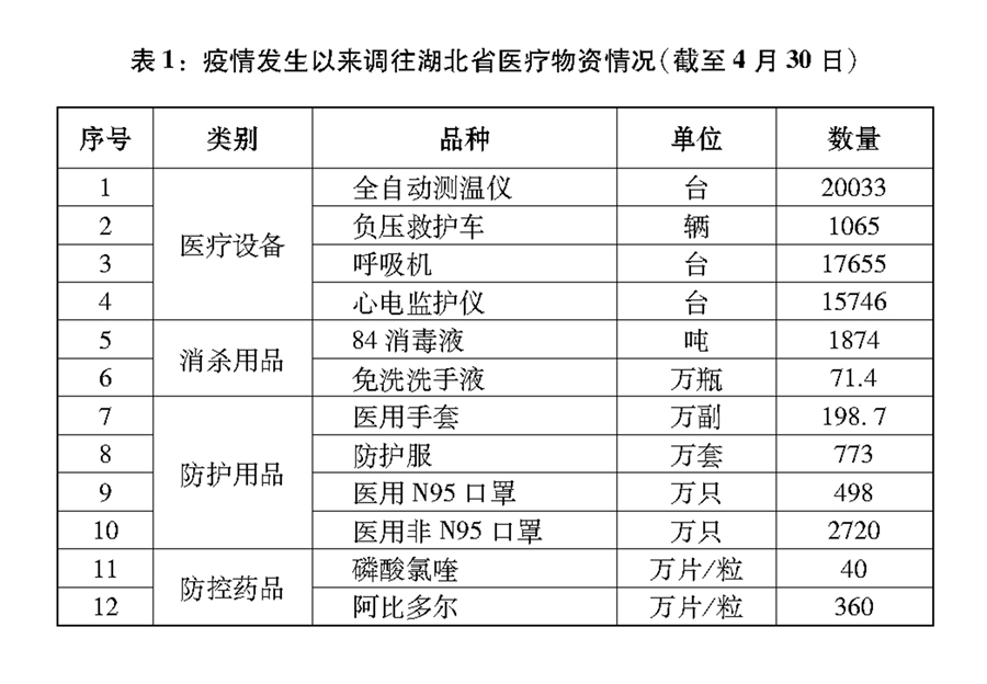 开展新中国成立以来规模最大的医疗支援行动。调动全国医疗资源和力量,全力支持湖北省和武汉市医疗救治。自1月24日除夕至3月8日,全国共调集346支国家医疗队、4.26万名医务人员、900多名公共卫生人员驰援湖北。19个省份以对口支援、以省包市的方式支援湖北省除武汉市以外16个地市,各省在发生疫情、防控救治任务十分繁重的情况下,集中优质医疗资源支援湖北省和武汉市。人民解放军派出4000多名医务人员支援湖北,承担火神山医院等3家医疗机构的医疗救治任务,空军出动运输机紧急运送医疗物资。各医疗队从接受指令到组建2小时内完成,24小时内抵达,并自带7天防护物资,抵达后迅速开展救治。在全国紧急调配全自动测温仪、负压救护车、呼吸机、心电监护仪等重点医疗物资支援湖北省和武汉市(表1)。从全国调集4万名建设者和几千台机械设备,仅用10天建成有1000张病床的火神山医院,仅用12天建成有1600张病床的雷神山医院。短短10多天建成16座方舱医院,共有1.4万余张床位。加强临床血液供应,10个省份无偿支援湖北省红细胞4.5万单位,血小板1762个治疗量,新鲜冰冻血浆137万毫升(不含恢复期血浆)。大规模、强有力的医疗支援行动,有力保障了湖北省和武汉市救治,极大缓解了重灾区医疗资源严重不足的压力。