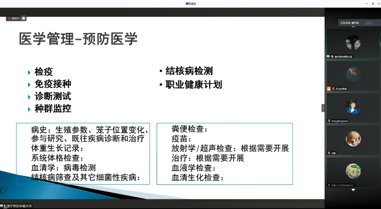 培训还邀请到上海益诺思生物技术股份有限公司潘学营博士,讲授实验猕猴医学管理和常见疾病及对福利和科研的影响。主要介绍了实验猕猴的分类学;实验猕猴的医学管理;实验猕猴的常见疾病;对福利和科研的影响。课程中,各位授课专家还针对学员提出的问题进行了解答与交流。