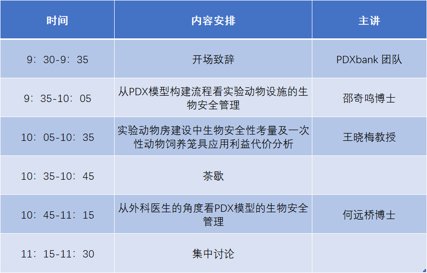 现代生物技术是一把“双刃剑”,它的蓬勃发展一方面为人类做出了巨大贡献,在另一方面它所引发的生物安全问题也日益严峻。近年来,随着大量PDX模型的成功建立,越来越多的研究者开始关注PDX模型研究中的生物安全防控问题。由于相关资料的缺乏以及涉及医院临床手术科室感染科、PDX模型操作者、动物房设计与管理和行业管理检测部门等多学科的交叉,PDX模型研究中的生物安全防控体系尚待完善。03 10月24日线上研讨会