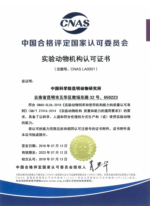 2018年8月12日从中国合格评定国家认可委员会(CNAS)获悉,中国科学院昆明动物研究所全国首家通过实验动物机构CNAS认可。中国合格评定国家认可委员会于2018年1月24日至26日组织专家组到昆明动物研究所进行现场评审,对机构的质量管理体系、兽医职责、IACUC职责、动物饲养与医护、设施条件、职业健康安全、实际操作示范等进行全面审查,得到专家组的一致好评,并给予宝贵建议。昆明动物研究所通过CNAS认可,进一步提升了实验动物和动物实验的管理水平,有效提升科研实验的服务水平,为模式动物表观与遗传研究设施的建设及管理奠定坚实的基础与条件保障。