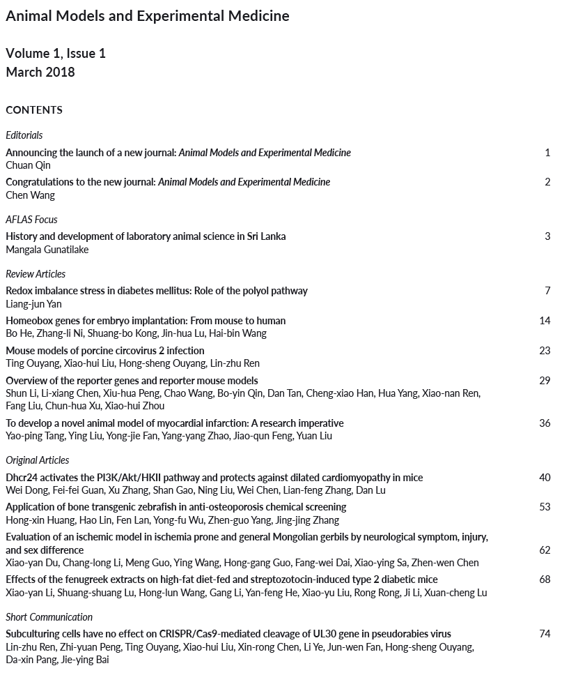 《动物模型与实验医学(英文)》(Animal Models and Experimental Medicine,AMEM)由中国实验动物学会、中国医学科学院医学实验动物研究所主办,与国际著名出版集团Wiley合作出版,于2018年3月创刊,第一期正式在线发布(Volume 1, Issue 1, March 2018)。期刊全文开放获取(Open Access),保证每篇文章可以第一时间被全世界的读者免费阅读、下载和共享。