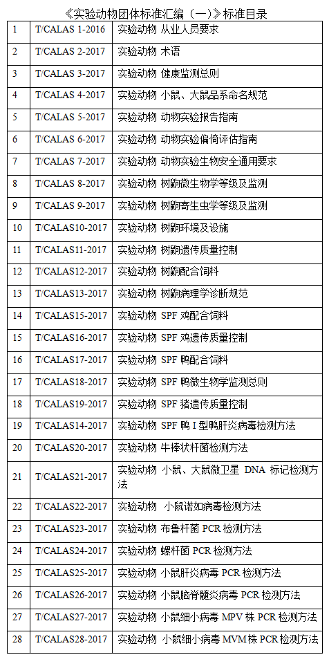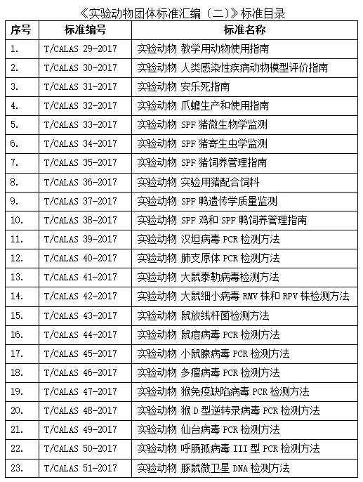 中国实验动物学会联合全国实验动物标准化技术委员会自2015年起开始团体标准的制定工作。迄今为止,中国实验动物学会已颁布实施51项团体标准,包括通用标准3项、管理标准9项、质量控制标准16项和检测方法23项,涉及从业人员要求、生物安全、模型评价、偏倚评估、动物命名、动物饲养和常见病原检测等。此51项团体标准均由中国科学出版社出版。