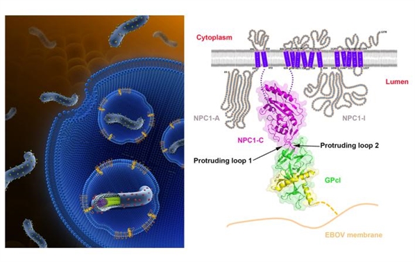 埃博拉病毒入侵宿主细胞模式图(左)博拉病毒表面激活态糖蛋白GPcl与其宿主的内吞体内受体NPC1的复合物三维结构图(右).2014-15年暴发的埃博拉病毒疫情在西非国家造成了1万余人死亡,引起了全人类社会的高度关注。此前,埃博拉病毒入侵宿主细胞的分子机制并不清楚。中国科学院微生物研究所高福团队在国际上率先解析出埃博拉病毒表面激活态糖蛋白与宿主细胞内吞体膜受体NPC1腔内结构域C的复合物三维结构,阐明两者如同“锁钥”的相互作用模式,从分子水平阐释了一种新的囊膜病毒膜融合激发机制(第五种机制),成为近年来国际病毒学领域的一大突破。该研究为抗病毒药物设计提供了新靶点,加深了人们对埃博拉病毒入侵机制的认识,为应对埃博拉病毒病疫情及防控提供重要的理论基础。研究成果在《细胞》(Cell,2016, 167:1511–1524)杂志上发表。