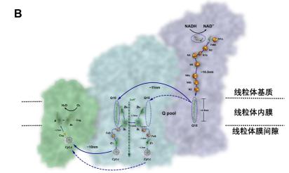 呼吸体电子传递及质子转运途径呼吸作用是生命体最基础的生命活动之一。由位于线粒体内膜的氧化磷酸化系统完成,为细胞提供能量。人类线粒体呼吸链氧化磷酸化系统异常会导致多种疾病,如阿尔茨海默病、帕金森病、多发性硬化、少年脊髓型共济失调以及肌萎缩性脊髓侧索硬化症等。哺乳动物呼吸体是由包括44个膜蛋白在内的81个蛋白亚基(69种不同蛋白分子)所构成的分子量高达1.7兆道尔顿的超级膜蛋白分子机器。清华大学杨茂君研究组先后在《自然》(Nature, 2016, 537: 639–643)和《细胞》(Cell, 2016,167:1598–1609)杂志发文,报道了呼吸链超级复合物结构。该结构是目前所解析的最复杂的非对称性膜蛋白超级分子机器的结构(图A,B),为进一步理解哺乳动物呼吸链超级复合物的组织形式、分子机理以及治疗细胞呼吸相关的疾病提供了重要的结构基础。组蛋白甲基化修饰在早期胚胎发育中的建立与调控