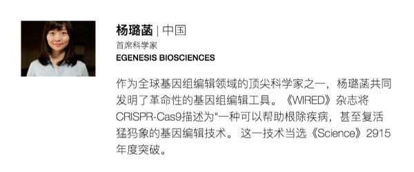 杨璐菡本科毕业于北京大学,并在哈佛大学获得了人类生物学与转化医学的博士学位。在哈佛,她师从有“合成生物学之父”美誉的美国科学院与工程学院双料院士 George Church 教授,研究 CRISPR-Cas9 基因编辑系统。目前,杨璐菡是 eGenesis 的联合创始人兼首席科学官。她所致力的基因编辑研究有望为人类器官移植带来革命性进展,被喻为“基因剪刀手”。