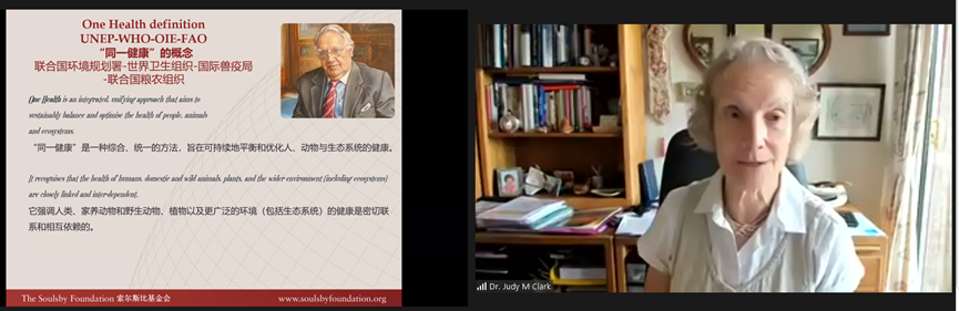 Dr. Judy MacArthur Clark作题为“One Health – Challenges and Opportunities”的报告,介绍了“One Health”是一种综合、统一的方法,旨在可持续地平衡和优化人、动物与生态系统的健康。强调人类、家养动物和野生动物、植物以及更广泛的环境(包括生态系统)的健康是密切联系和相互依赖的。同一健康需要动员多个部门、各个级别,核心是增进沟通。阐述了索尔斯比基金会如何通过“同一健康”奖学金来支持研究。鼓励相关专业人员(特别是职业生涯早期人员)能够建立国际多学科合作,获得全球视角,并体验多种文化背景下的“同一健康”。