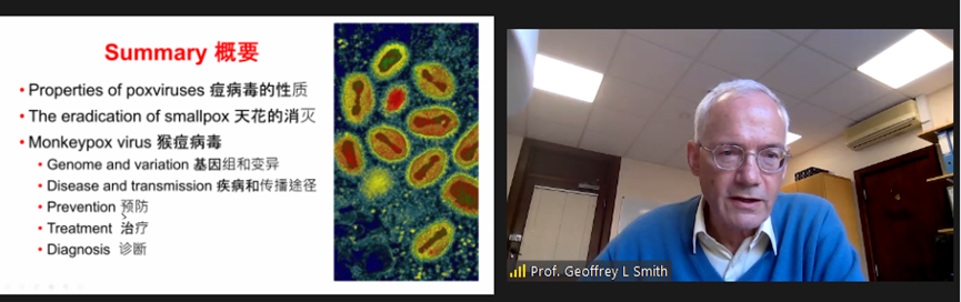 Prof. Geoffrey L Smith作题为“Monkeypox virus”的报告,介绍了猴痘病毒基因组及变异和当前流行情况。从2022年4月开始,猴痘病毒大流行,已蔓延到世界大部分地区。基因组测序表明,引起本次疫情的猴痘病毒毒株起源于西非,与2018年流行的毒株相比,已经经历了APOBEC3C介导的基因组变异,表明该病毒已传播数年。提出了到目前为止确定的突变大概率不会改变猴痘病毒的复制、传播能力、毒性或药物敏感性。强调了尽管面对猴痘病毒具有挑战,但与新冠肺炎流行不同的是,猴痘是一种易于识别的疾病,可以通过有效的疫苗进行预防,使用抗病毒药物治疗,并通过检测方法进行诊断。