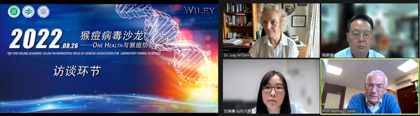 在访谈环节,Professor Geoffrey L Smith进一步指出,猴痘病毒在人类之间的传播需要密切接触,没有证据表明导致2022年疫情的毒株更具传染性。同时总结了猴痘目前预防和治疗的概况。陆家海教授重申了“One Health”的理念,中国应加强联防联控等机制,践行“One Health”的理念。中国政府“人民至上、生命至上”的抗疫理念和“内防反弹、外防输入”的防疫策略是一个负责任大国应有的责任与担当。中国将秉持人类卫生健康共同体的理念,齐心协力、守望相助、携手应对,坚决遏制疫情蔓延势头,打赢疫情防控全球阻击战,护佑世界和人民康宁。 Dr. Judy MacArthur Clark指出,我们需要更好地教育和培训相关人员接受 “One Health”的理念,更需要全球医学组织和政府更好的合作。同时介绍了索尔斯比基金会如何通过“同一健康”奖学金来支持相关研究。