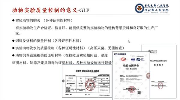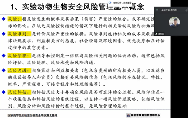本次培训邀请到湖北省实验动物学会唐利军会长讲授《实验动物生物安全风险评估与职业健康管理》;中国医学科学院医学实验动物研究所魏强教授讲授《动物实验中的生物安全保障要点》;华中科技大学同济医学院附属同济医院熊文静主任讲授《小鼠生物净化及遗传物质的冷冻与复苏》;赛诺菲公司全球研发中心转化体内模型研究平台庞万勇博士讲授《实验动物医师的职责和作用》;武汉大学人民医院范明霞主任讲授《实验动物选择与动物实验质量控制》。