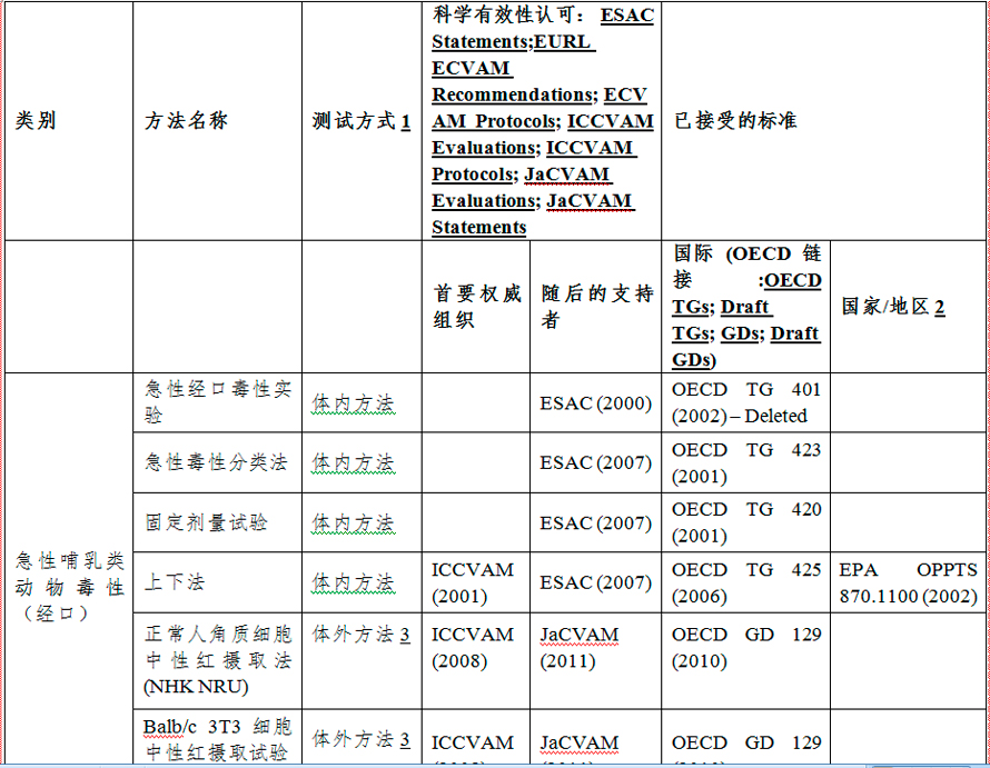 2016年5月,AltTox(推进毒理学检测中使用非动物方法的网站)更新了《已经验证及已被接受的替代方法列表》,该表是AltTox.org网站点击量最高的页面之一。正如很多AltTox用户已了解的,该表提供了ICCVAM (美国)、 EURL ECVAM (欧盟)和/或 JaCVAM (日本)已支持的替代方法。除此之外, 表中也列入了OECD指导文件内容。自第一版列表于2007年12月在AltTox发布至今,该表仍是唯一可获得的整合了毒理方面三大权威替代方法验证中心信息的资料。我们最新的焦点文章对这一极具价值的资源做了简要介绍,并对表格中最重要并值得注意的更新内容做了总结。