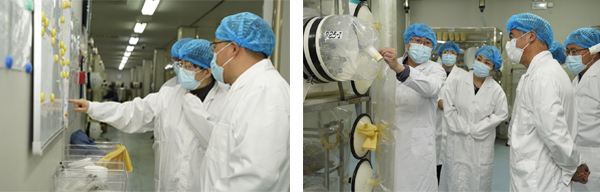 随后评价组专家一行前往华阜康公司隔离生产车间,对新区走廊、生产车间各区消毒前室、洗刷间、动物尸体储存间,研发细胞间以及检测实验室开展现场考察、评价。专家们通过查看设施、调阅资料以及现场交流等方式,对华阜康公司屏障设施、隔离环境、检测实验室等现场硬件条件以及管理体系等档案文件进行了全面、细致的现场评价和文件审核。