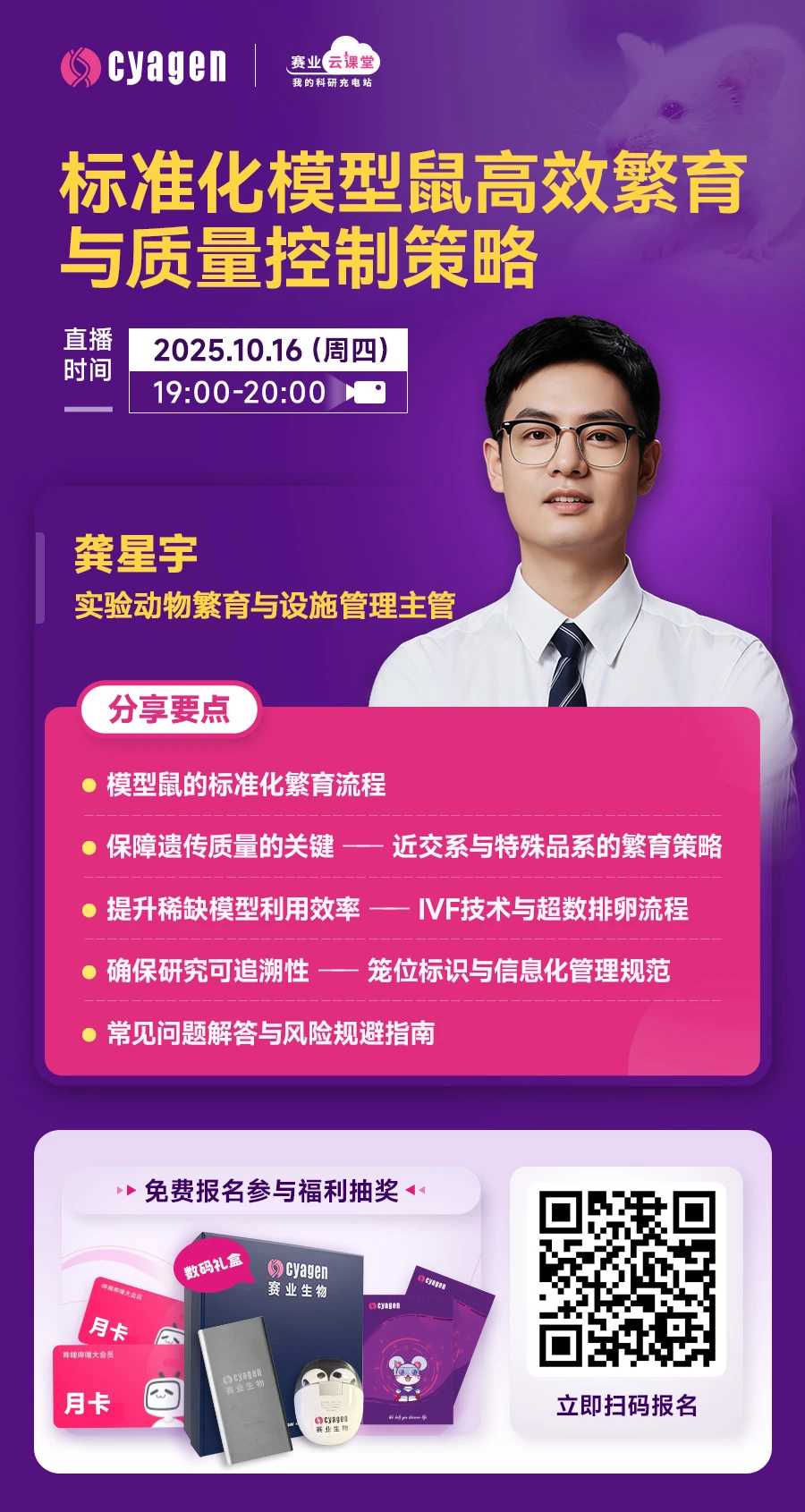 为帮助大家破解这些实际困境,10月16日,由赛业生物实验动物繁育与设施管理主管龚星宇带来「标准化模型鼠高效繁育与质量控制策略」线上课程。本次课程从模型鼠的标准化繁育流程讲起,系统性地解析这些核心痛点,将高效繁育策略与全流程质量控制深度融合,为您的科研工作提供从理论到实践的全方位解决方案。我们将不仅告诉您“如何做”,更深入阐释“为何如此做”,助您构坚实可靠的动物实验基础。