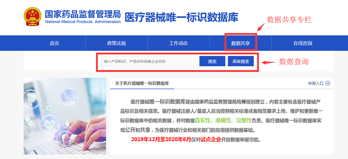 为贯彻落实党中央、国务院医药卫生体制改革和治理高值医用耗材改革有关精神,国家药监局会同国家卫生健康委联合开展了医疗器械唯一标识系统试点工作。按照工作部署,2019年12月10日唯一标识数据库正式上线,2020年3月31日开放数据库共享功能,以查询、下载、接口对接等三种方式,供公众、医疗器械生产经营企业和医疗机构等各方查询使用。