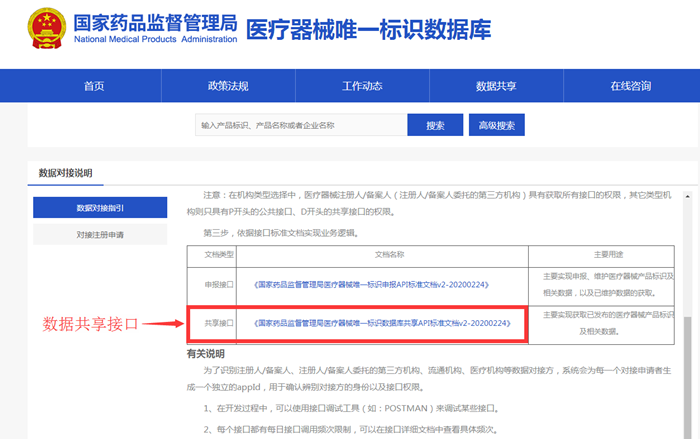 医疗器械唯一标识数据库设置接口对接的数据共享方式,点击首页“数据对接说明”栏目,在线填报对接申请并获取对接授权码。下载《国家药品监督管理局医疗器械唯一标识数据库共享API标准文档》最新版(图4所示),按文档要求开发对接功能,经联调测试通过后,用户可通过接口获取数据。