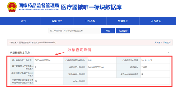 为方便社会公众查询,医疗器械唯一标识数据库首页设置了查询功能和高级查询(图1所示),满足用户多条件、多角度的查询要求。数据查询详情按产品标识不同特点展示(图2所示),同时设置了查询数据的折叠或展开、下载、打印、历史版本记录等辅助功能,满足用户多样化需求。