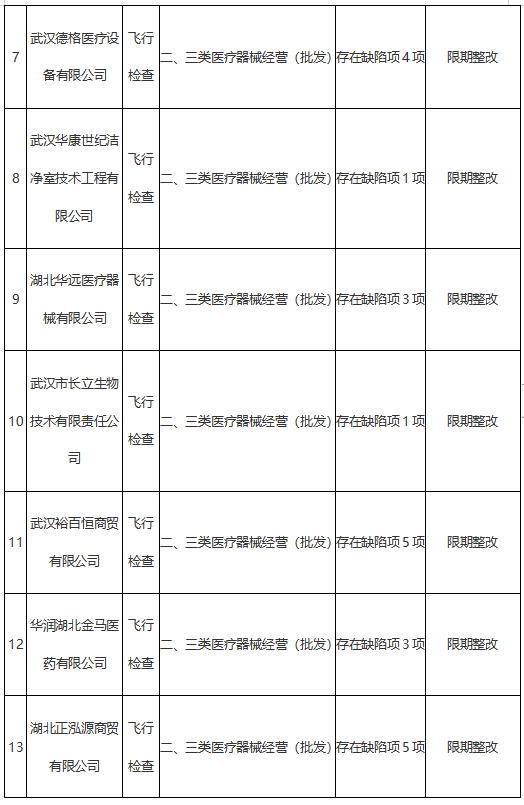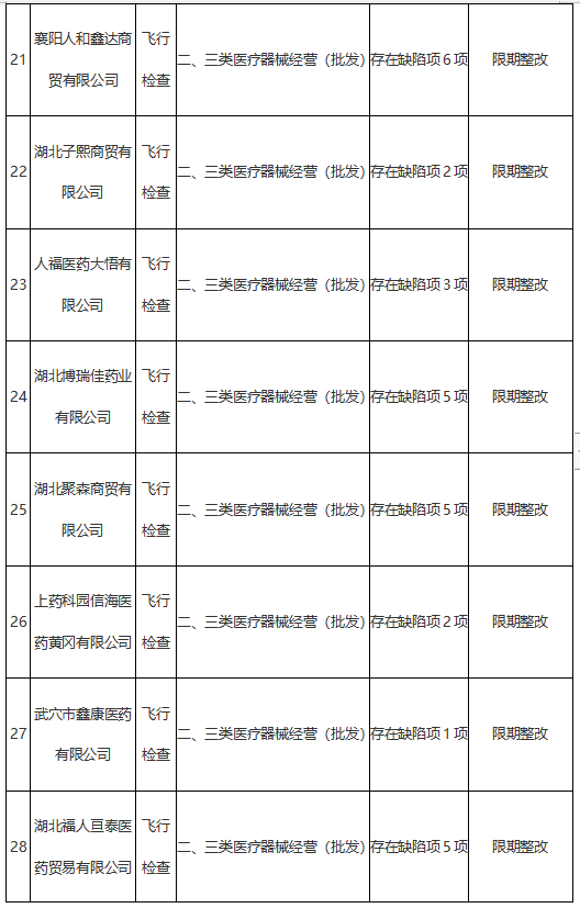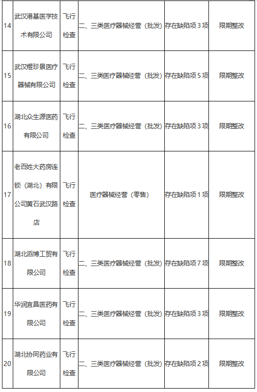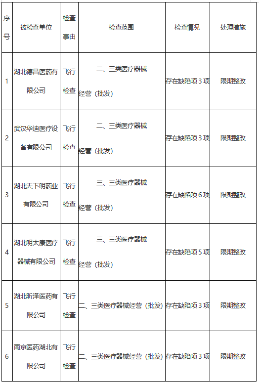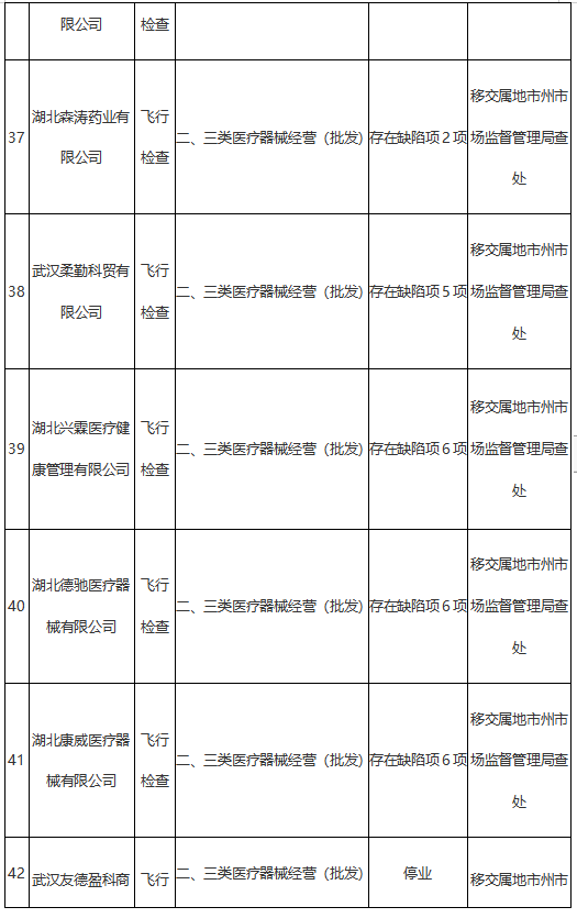 中国网财经11月20日讯 日前,湖北省药品监督管理局发布公告称,2019年9月,在对54家医疗器械经营企业进行的飞行检查中发现,湖北德昌医药有限公司等36家企业违反了《医疗器械经营管理质量规范》,被责令限期整改;湖北兴霖医疗健康管理有限公司等5家企业存在严重违法违规行为,被移交属地市州市场监督管理局查处。