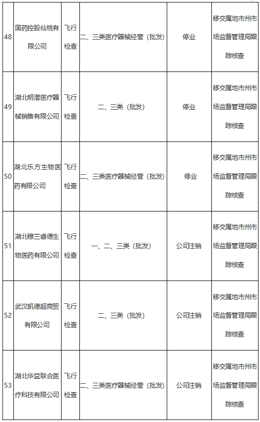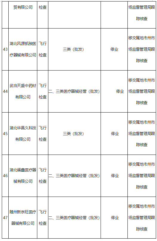 湖北省药品监督管理局表示,检查时已停业或者已注销的企业,责成属地市州市场监督管理局跟踪核查。