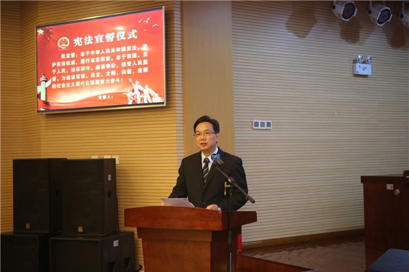 上午9时,宣誓仪式正式开始。面对鲜艳的国旗和庄严的国徽,全体人员同唱中华人民共和国国歌,领誓人刘文斌右手举拳,左手抚按宪法,宣读誓词,其他宣誓人列队站立跟诵誓词。