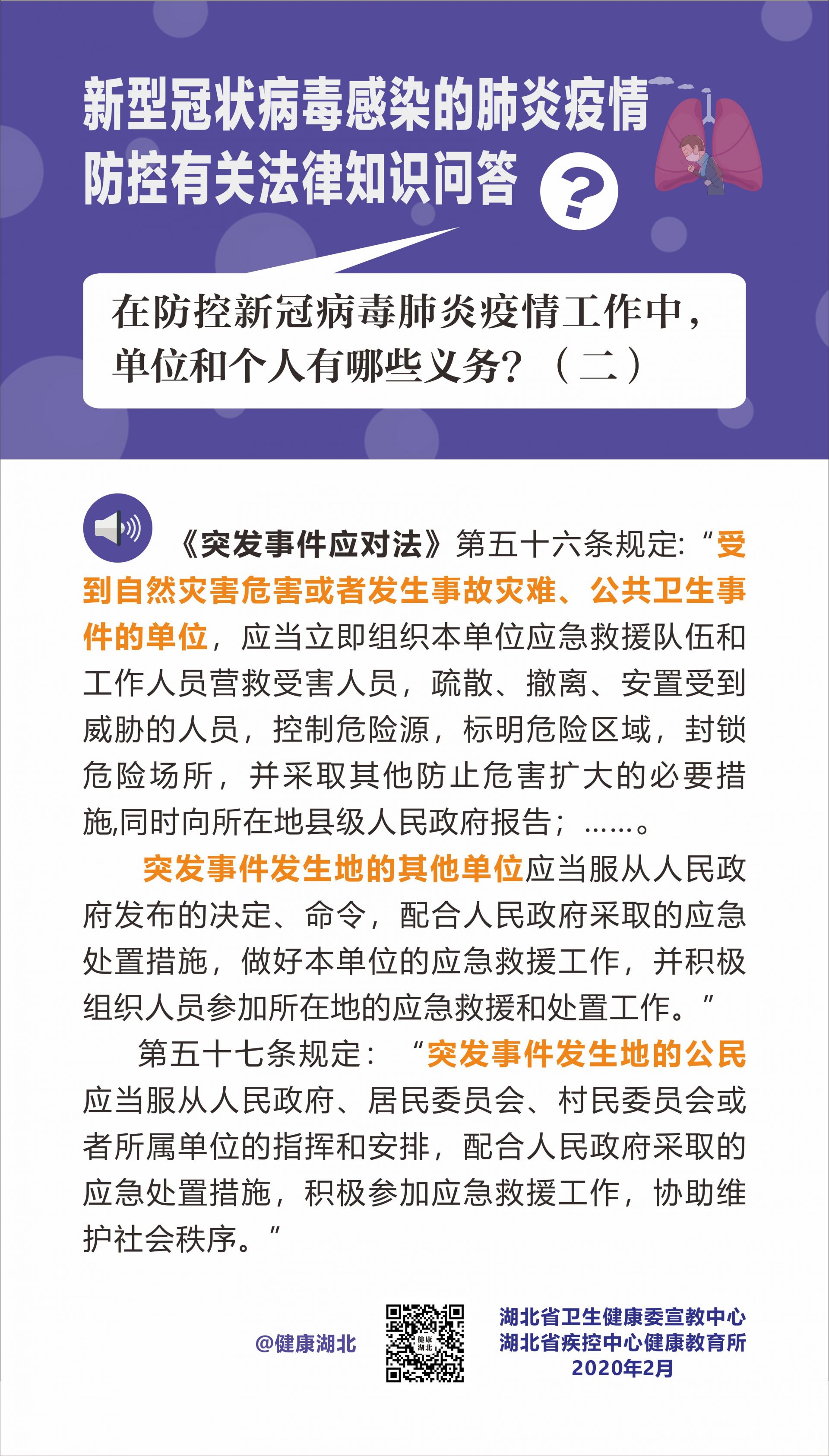 第五十七条规定:“突发事件发生地的公民应当服从人民政府、居民委员会、村民委员会或者所属单位的指挥和安排,配合人民政府采取的应急处置措施,积极参加应急救援工作,协助维护社会秩序。”