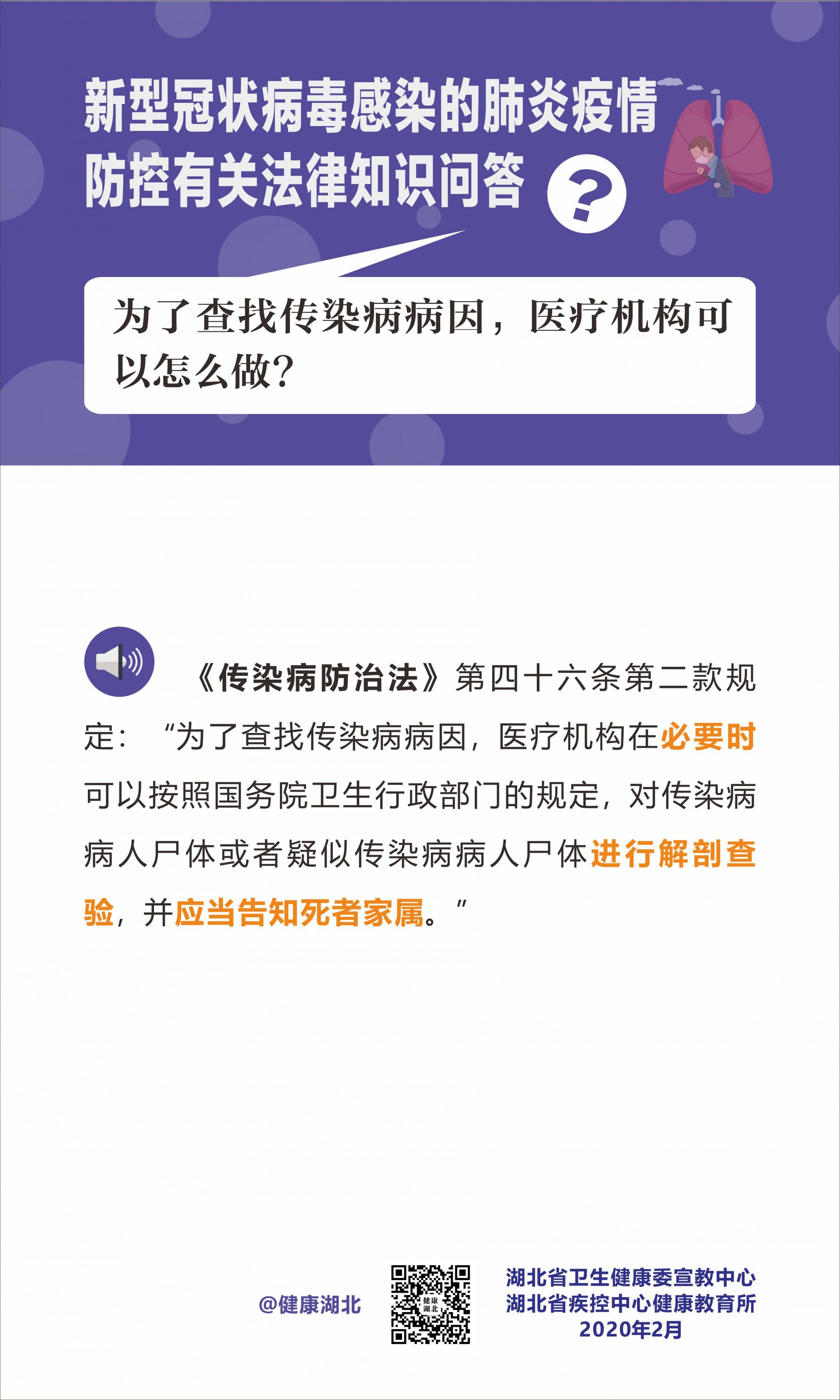 《传染病防治法》第四十六条第二款规定:“为了查找传染病病因,医疗机构在必要时可以按照国务院卫生行政部门的规定,对传染病病人尸体或者疑似传染病病人尸体进行解剖查验,并应当告知死者家属。”