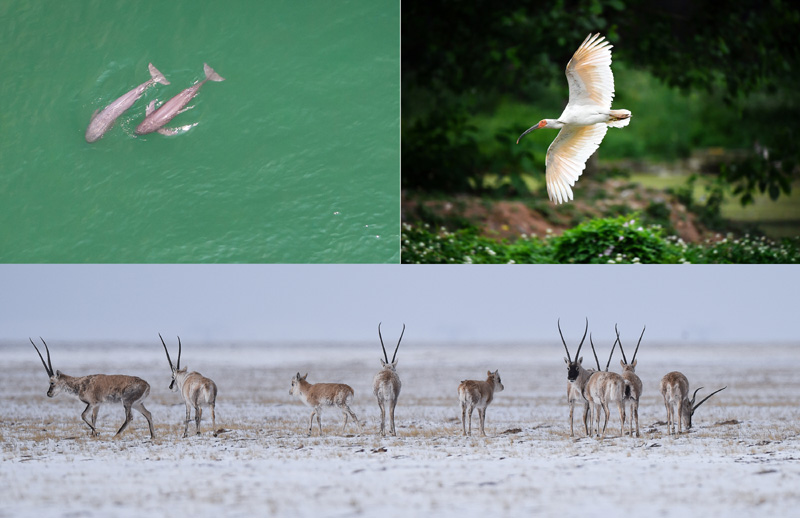 这是一张拼版照片:左上图为在湖北省宜昌市江边,长江江豚在水中嬉戏(无人机照片,新华社记者肖艺九5月11日摄);右上图为陕西省汉中市洋县朱鹮生态园内的朱鹮(新华社记者刘潇5月13日摄);下图为藏羚羊在三江源可可西里地区活动(新华社记者吴刚4月20日摄)。新华社发