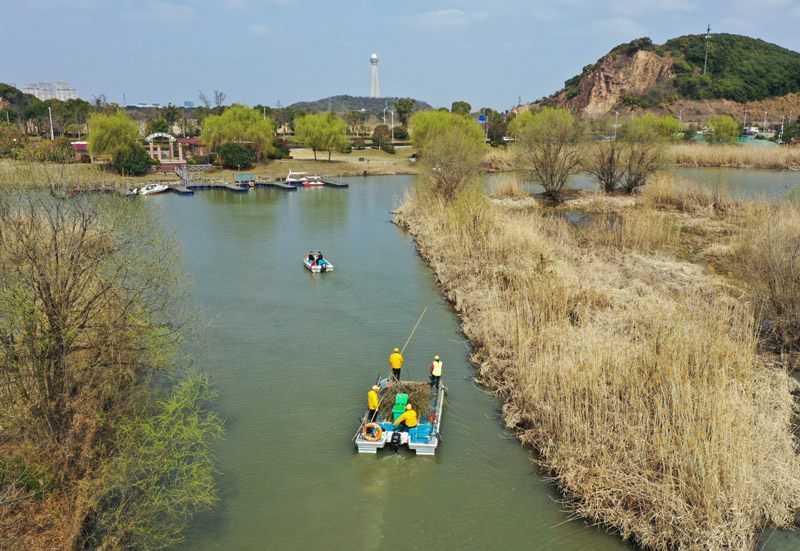 2021年2月24日,浙江湖州吴兴区八里店镇移沿山村河长带队在移沿山村开展巡河、保洁作业(无人机照片)。新华社记者 翁忻旸 摄