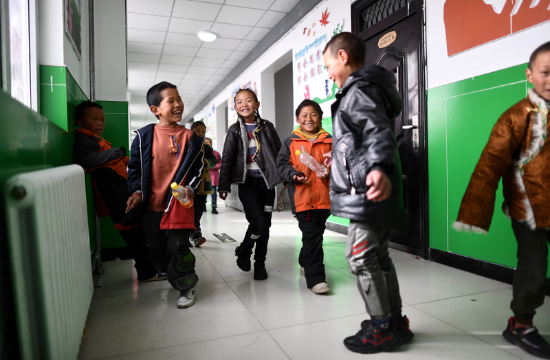 2021年3月26日,青海玛多县民族寄宿制中学二年级的学生在课间玩耍。该校目前采用清洁取暖方式,学生的学习和生活环境大为改善。新华社记者 张宏祥 摄
