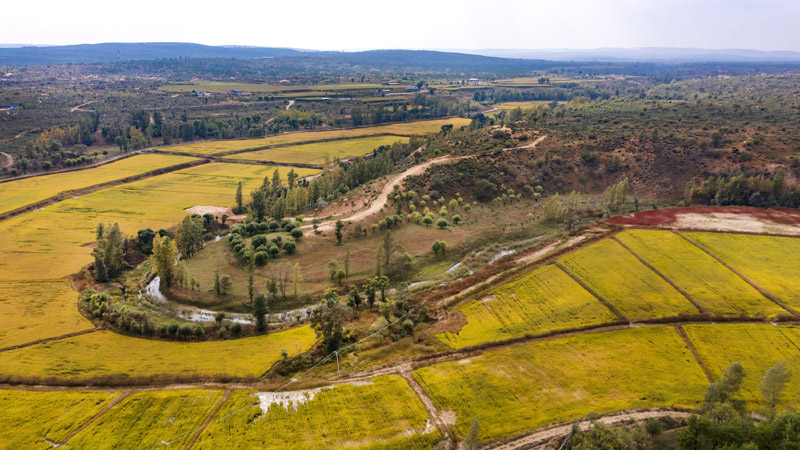 2020年9月26日拍摄的陕西省靖边县黄蒿界镇马季沟村稻田(无人机照片)。近年来,靖边县实施了“三北”防护林、退耕还林、流域治理等生态建设工程,北部沙漠区裸露明沙完全消失,中部农田林网蔚然成荫,南部山区夏季绿色满山。新华社记者 陶明 摄
