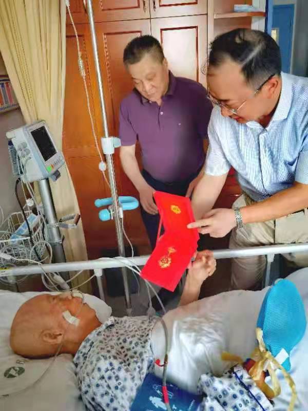 丁昌钧是1942年参加革命,1944年入党的离休老干部,因身体不适,正在医院治疗。病床前,刘荣山关切细致地询问老人的身体生活状况并祝端午安康,同时送上了“光荣在党50年”纪念章和“2021年度优秀共产党员”荣誉证书。丁昌均的家人说,老人因病多次住院,但每次一住院首先想到的就是一定记得帮他及时交纳党费,怕自己糊涂了迟交党费。刘荣山感动的说:“老党员一辈子为党为国奉献付出。丁老为医药产业发展、药品监管事业倾注了半生心血。今年党中央第一次为老党员颁发‘光荣在党50年’纪念章,就是让我们后辈向他们学习、向他们致敬、向他们看齐。请丁老保重身体,祝早日康复。”