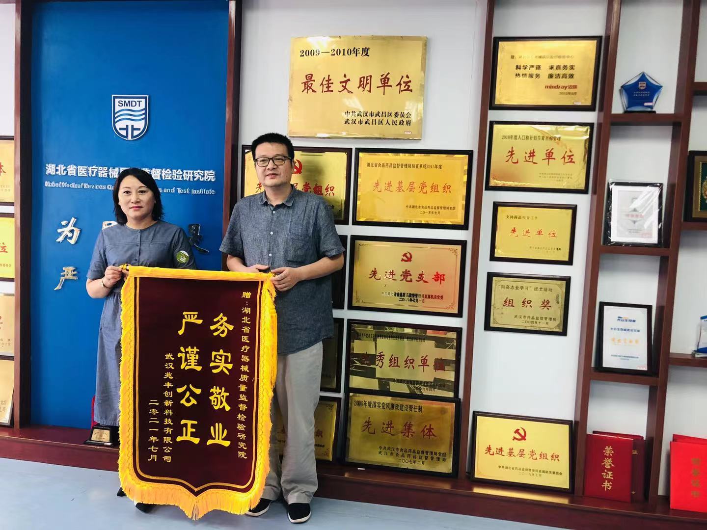 日前,武汉兆丰创新科技有限公司和武汉长立生物技术有限责任公司分别送上了绣有“务实敬业、严谨公正”“热情服务、高效为民”的锦旗,深深表达对器械院的感激之情。