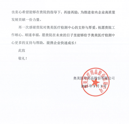 9月30日,奥美医疗用品股份有限公司负责人为省医疗器械质量监督检验研究院送上了一面锦旗和一封诚挚的感谢信,感谢省器械院“服务热情、技术精湛,心系企业,为企排忧”。这是省器械院在九月收获的第二面锦旗,今年的第五面锦旗。