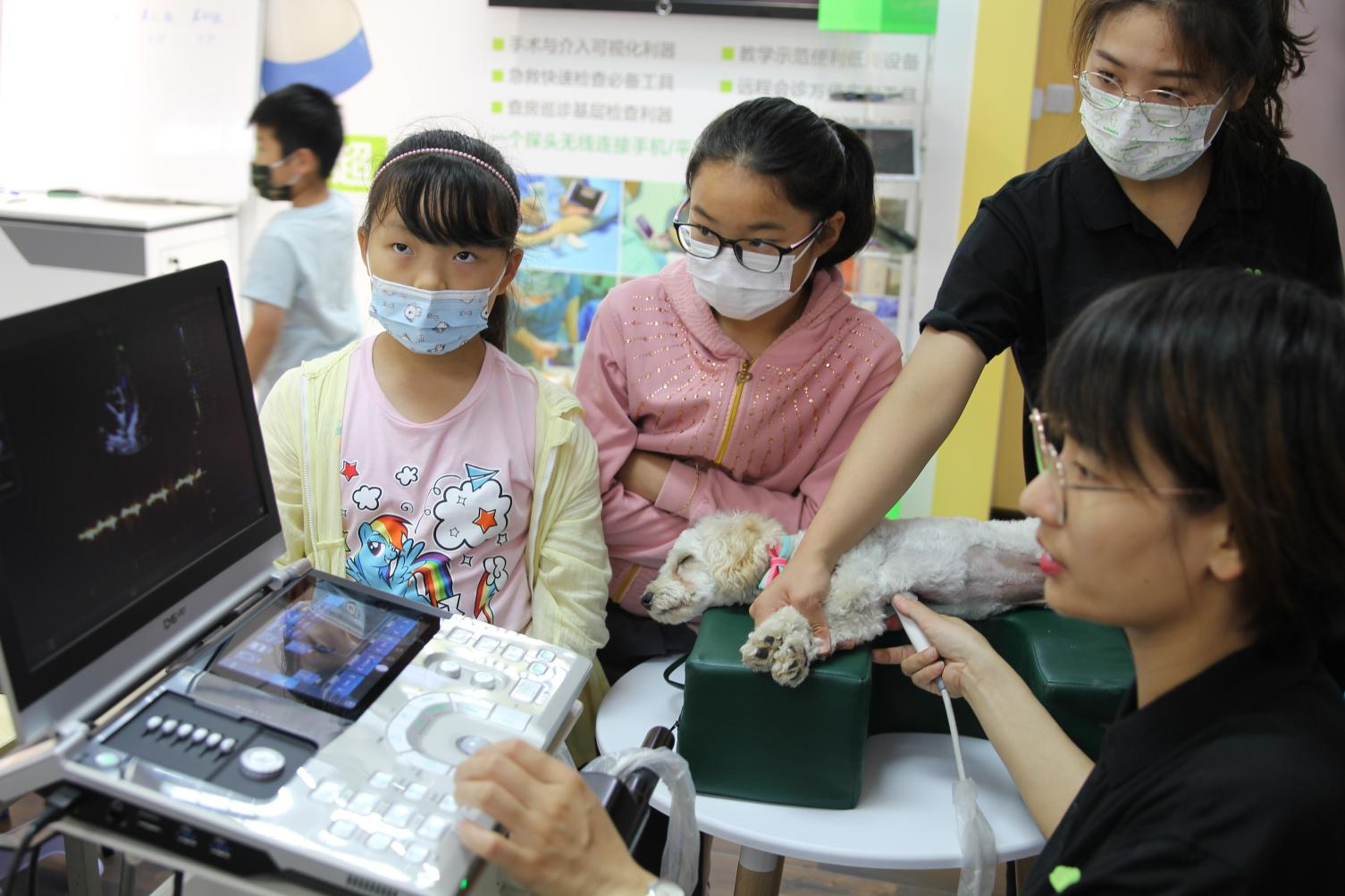本次科普活动,孩子们体验的产品是兽用超声设备,体验模特是一只萌萌的小泰迪犬,瞬间萌化了孩子们的心。小朋友们通过小小的探头来探听小动物的身体构造,心脏、肾脏、肝、胆、脾等,“我看到了看到了”,一阵阵激动的欢呼声,从中国医用超声科普基地中频频传出。