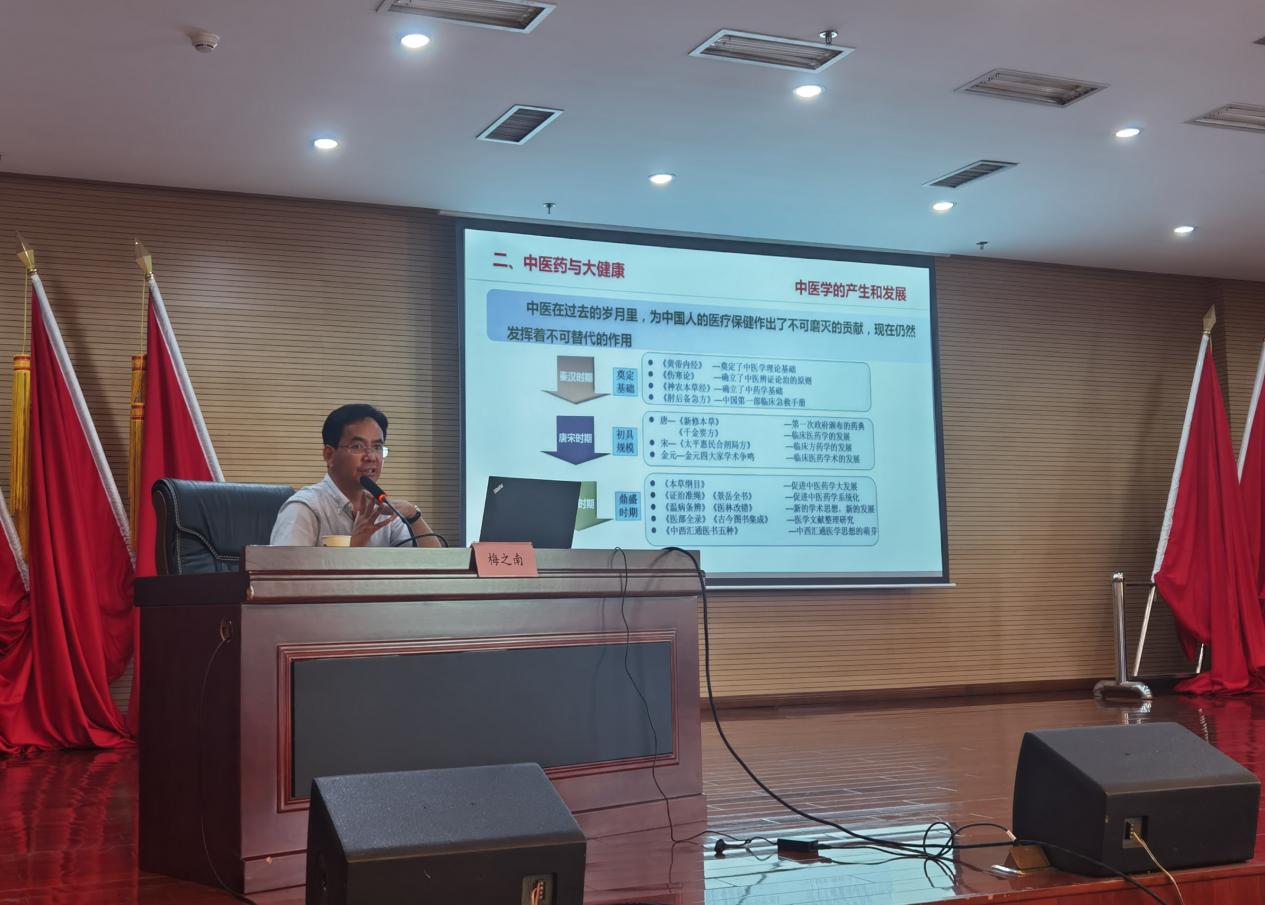 梅之南围绕《中医药与大健康》这一主题,系统地阐述了药物的发展史、中医学的产生和发展、中医药事业的发展、中药的保护与发展、我省中医药的优势等内容,提出了中医药发展的湖北对策,为药品监管干部开拓了眼界,打开了思路。