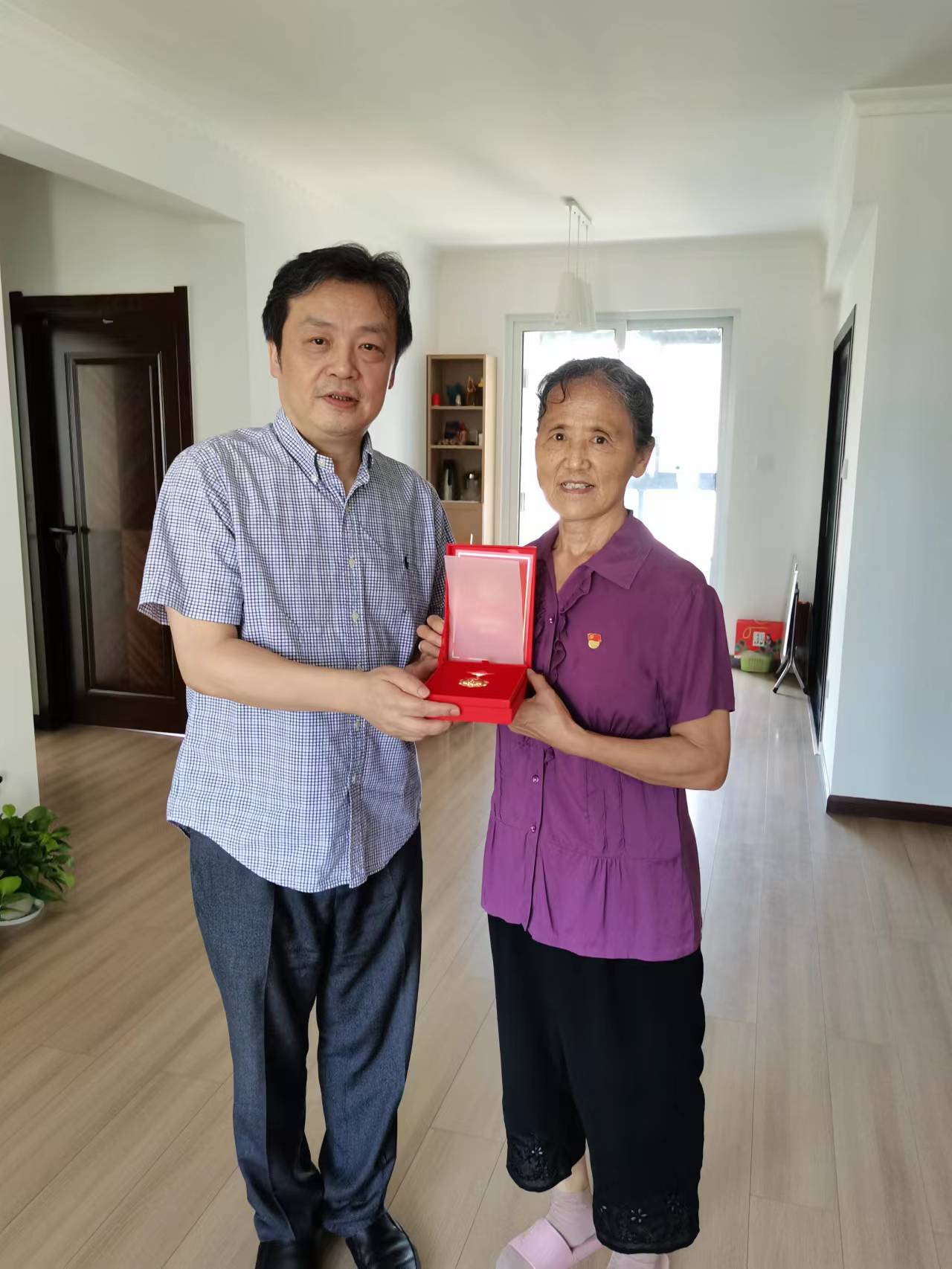 院领导曹全胜、何开勇代表院党委,带领党政办等部门,来到老党员家中探望慰问,举行简单而庄重的仪式,分别向陈维信、邸改琴等5位老党员颁发“光荣在党50年”纪念章,并与老党员重温入党誓词,向老党员表示祝贺,对他们为药检事业做出的贡献表示敬意。
