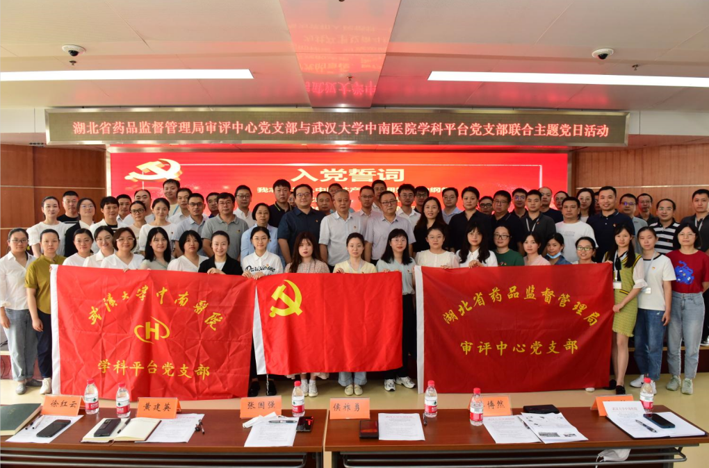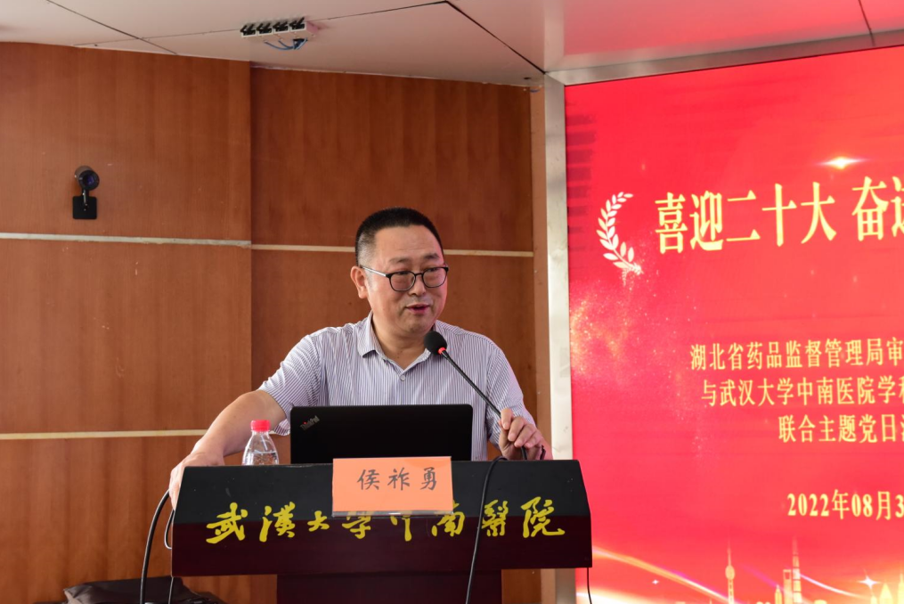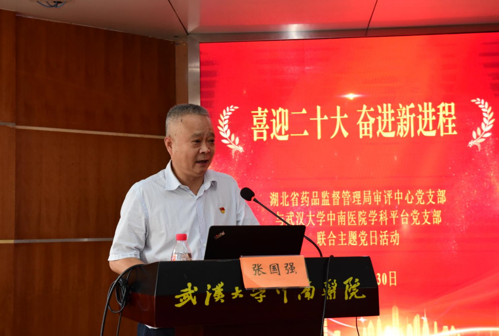 2022年8月30日,为深入学习贯彻习近平总书记考察湖北重要讲话精神,推进落实省第十二次党代会决策部署,以优异成绩喜迎中共二十大召开,省局审评中心党支部与武汉大学中南医院学科平台党支部开展“喜迎二十大,奋进新进程”联合主题党日活动,省局二级巡视员张国强、院党委副书记、纪委书记侯祚勇参加此项活动并做主题发言。