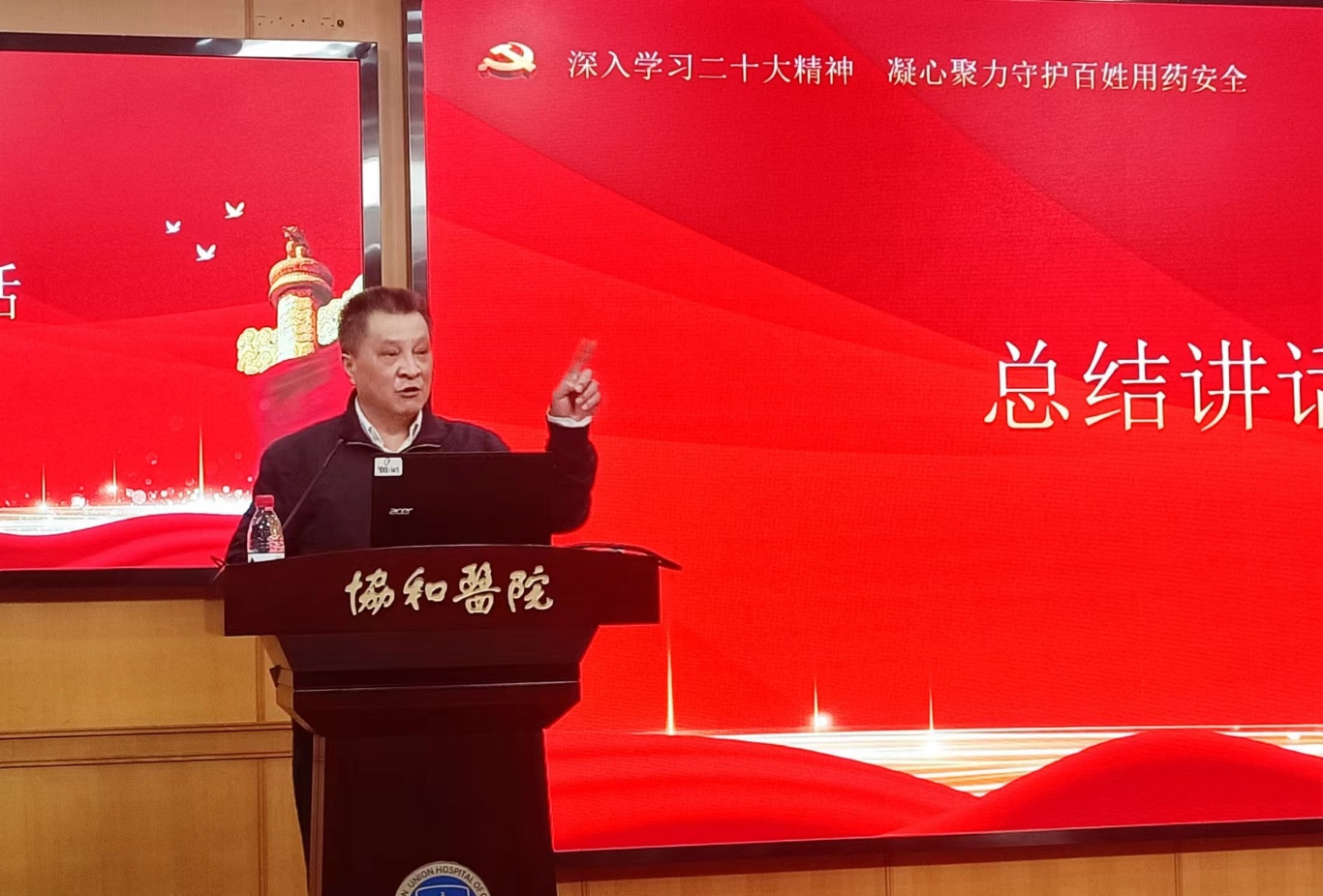 协和医院党委副书记孙晖致辞,省局一级巡视员朱与杰同志结合自身学习体会,从“明确战略位置、完善药品安全体系、加强能力建设、强化监管履职及其监督、提升药品安全治理效能”等5个方面,为大家上了一堂内涵丰富的党课;医院药学部吕永宁教授介绍了“药学高质量建设成果及发展前景”,参加活动的全体党员集体学习党的二十大精神,重温入党誓词,5名党员代表交流了学习体会。