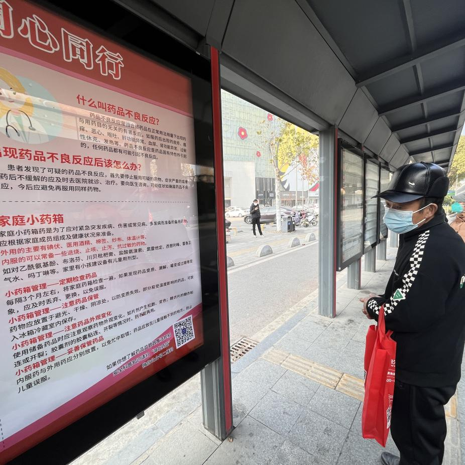 1月11日,在徐东公交车站的市民张女士告诉记者,他发现站牌张贴的安全用药“家庭小药箱”海报,图文并茂、简单易懂,非常方便乘客在等车时阅读。