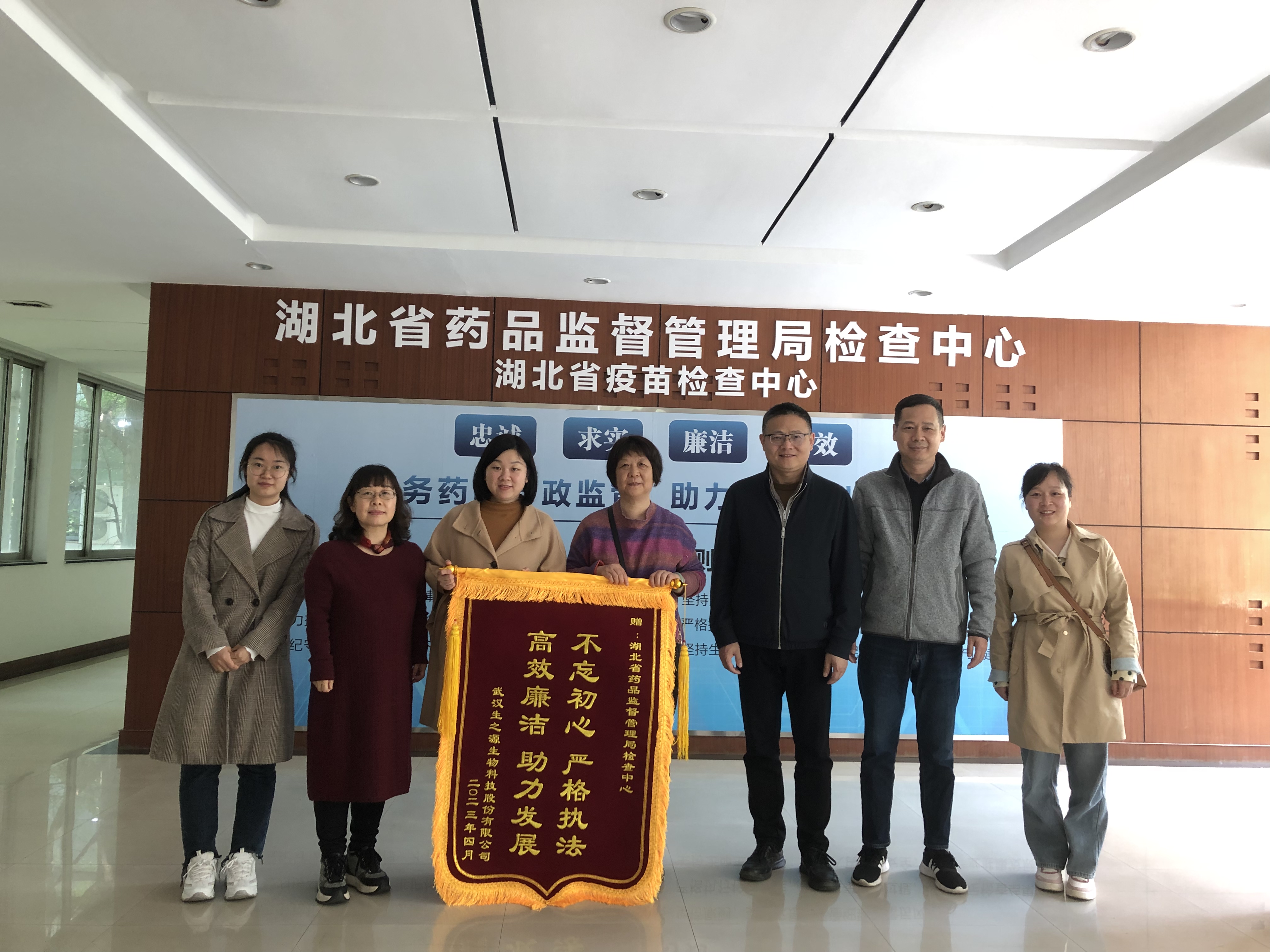 4月26日,武汉生之源生物科技股份有限公司将一面印有“不忘初心、严格执法、高效廉洁、助力发展”的锦旗送到检查中心,对检查中心在企业申办新冠抗原检测试剂盒生产地址许可变更过程中提供的专业检查和高效服务表示感谢。检查中心负责人对企业在疫情防控期间所做的贡献表示敬意和感谢,并建议企业更加重视产业规划和布局,在疫情常态化防控期间做好保质保供工作。