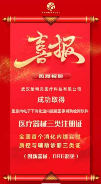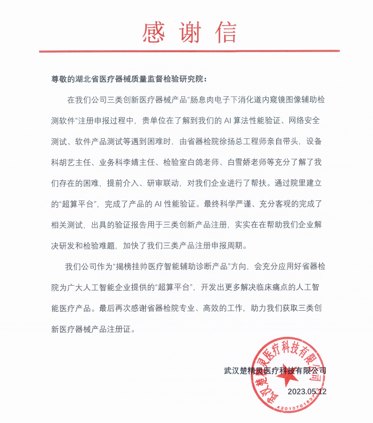 武汉楚精灵医疗科技有限公司(以下简称“楚精灵公司”)的“肠息肉电子下消化道内窥镜图像辅助检测软件”正式获批国家药品监督管理局(NMPA)创新医疗器械三类注册证,这是全国首个结直肠镜检查质量控制及辅助诊断创新医疗器械三类认证,也是湖北省首个人工智能辅助诊断三类认证。2023年5月12日,“楚精灵公司”给省器械院发来喜报和感谢信。