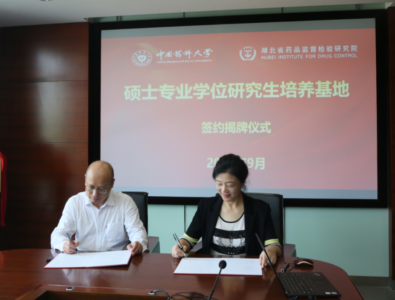 9月18日,中国药科大学硕士专业学位研究生培养基地揭牌仪式在省药检院光谷生物城院区举行。省药监局副局长杜汉业,中国药科大学药学副院长院狄斌、教授涂家生、尹莉芳、孙春萌,省药检院院长姜红共同为“湖北省药品监督检验研究院—中国药科大学硕士专业学位研究生培养基地”揭牌,双方签署“建立全日制硕士专业学位研究生培养基地的合作协议”。