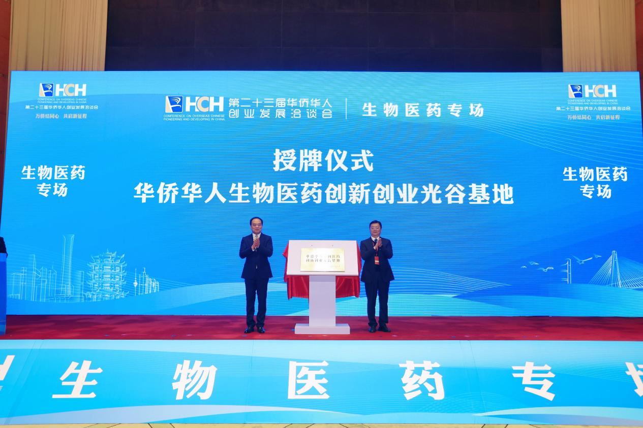 省委统战部副部长李涛和武汉国家生物产业基地建设服务中心主任丁慧琛共同为“华侨华人生物医药创新创业光谷基地”揭牌。