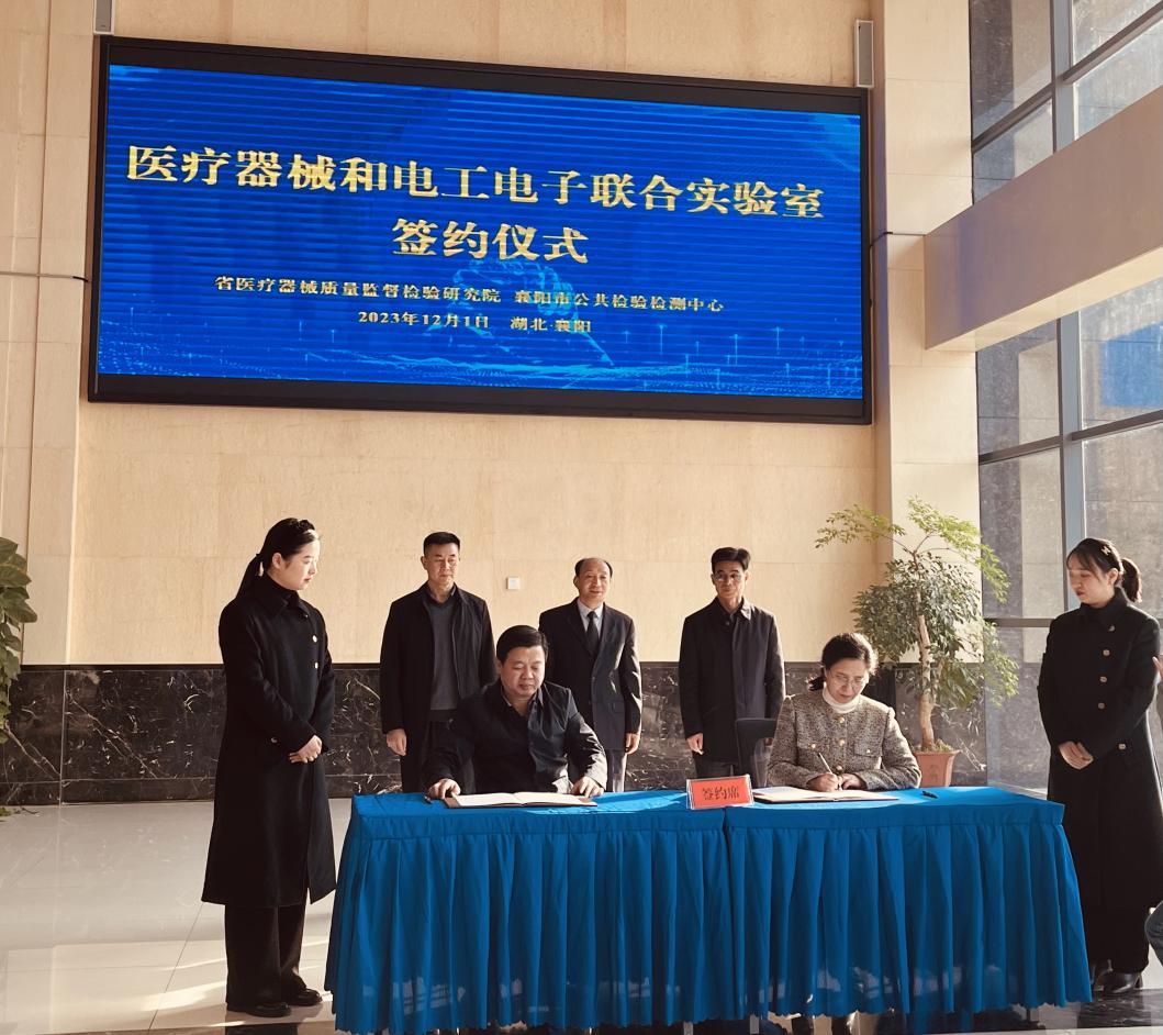2023年12月1日省器械院和襄阳公检中心联合共建“医疗器械和电工电子联合实验室”签约揭牌仪式在襄阳市成功举行,省药品监督管理局党组成员、副局长贡勇斌,襄阳市人民政府副秘书长吴恒出席签约揭牌仪式并讲话。