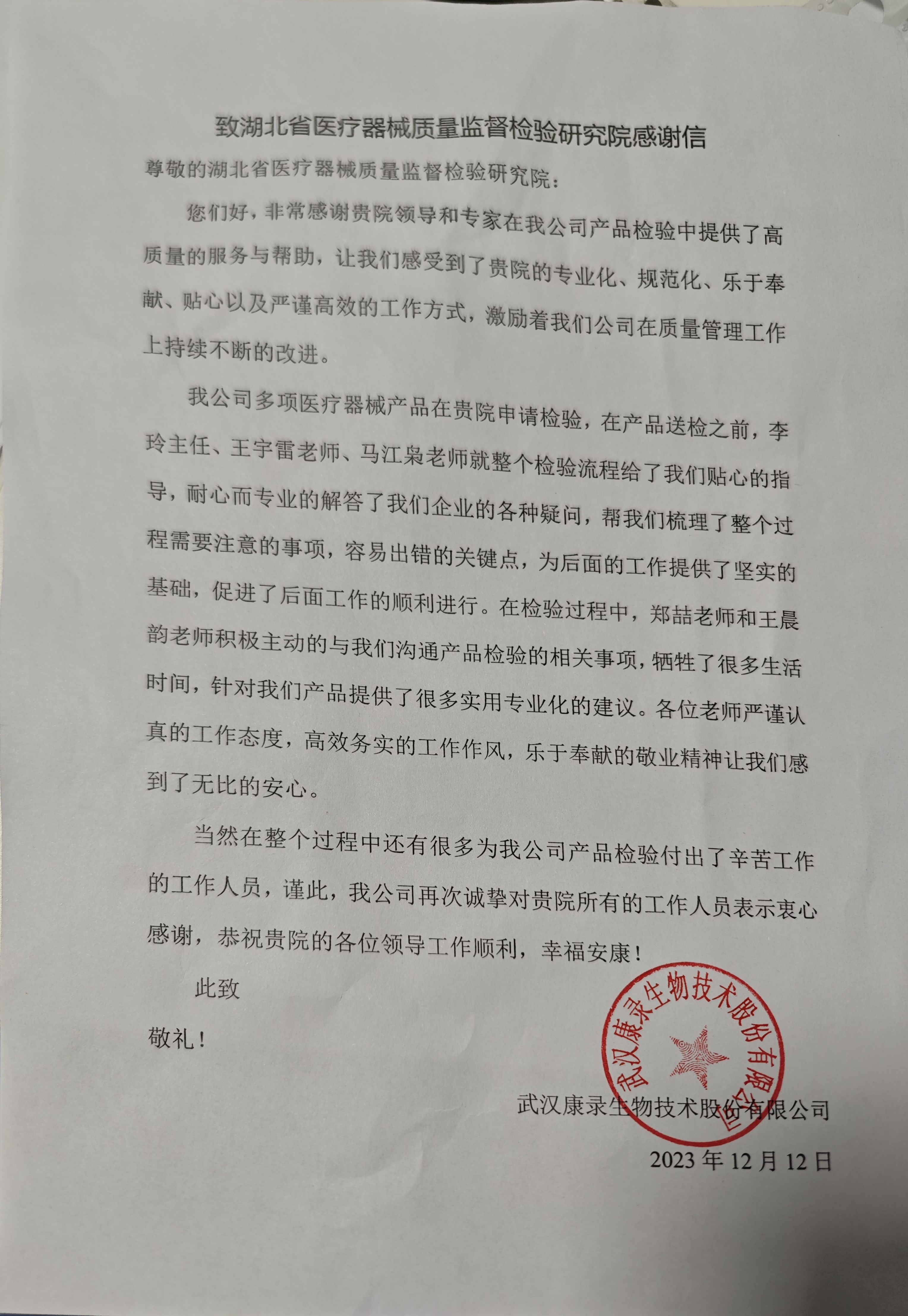 2023年12月12日,武汉康录生物技术股份有限公司相关负责人亲自登门送来锦旗和感谢信,感谢省器械院在业务受理、检验流程、技术服务等方面给予的大力支持,为公司5个三类体外诊断试剂快速进入注册申报环节发挥了重要作用。