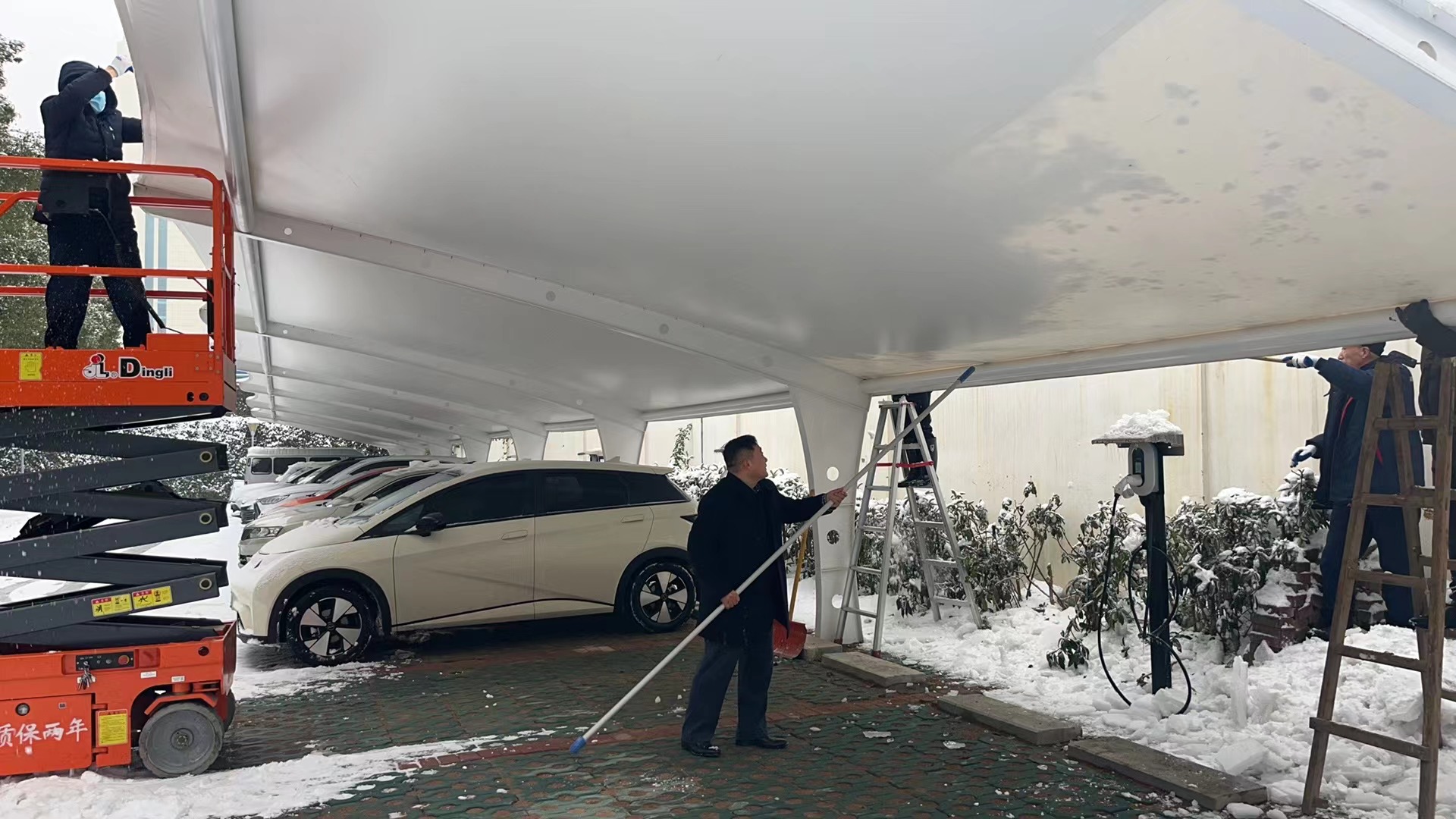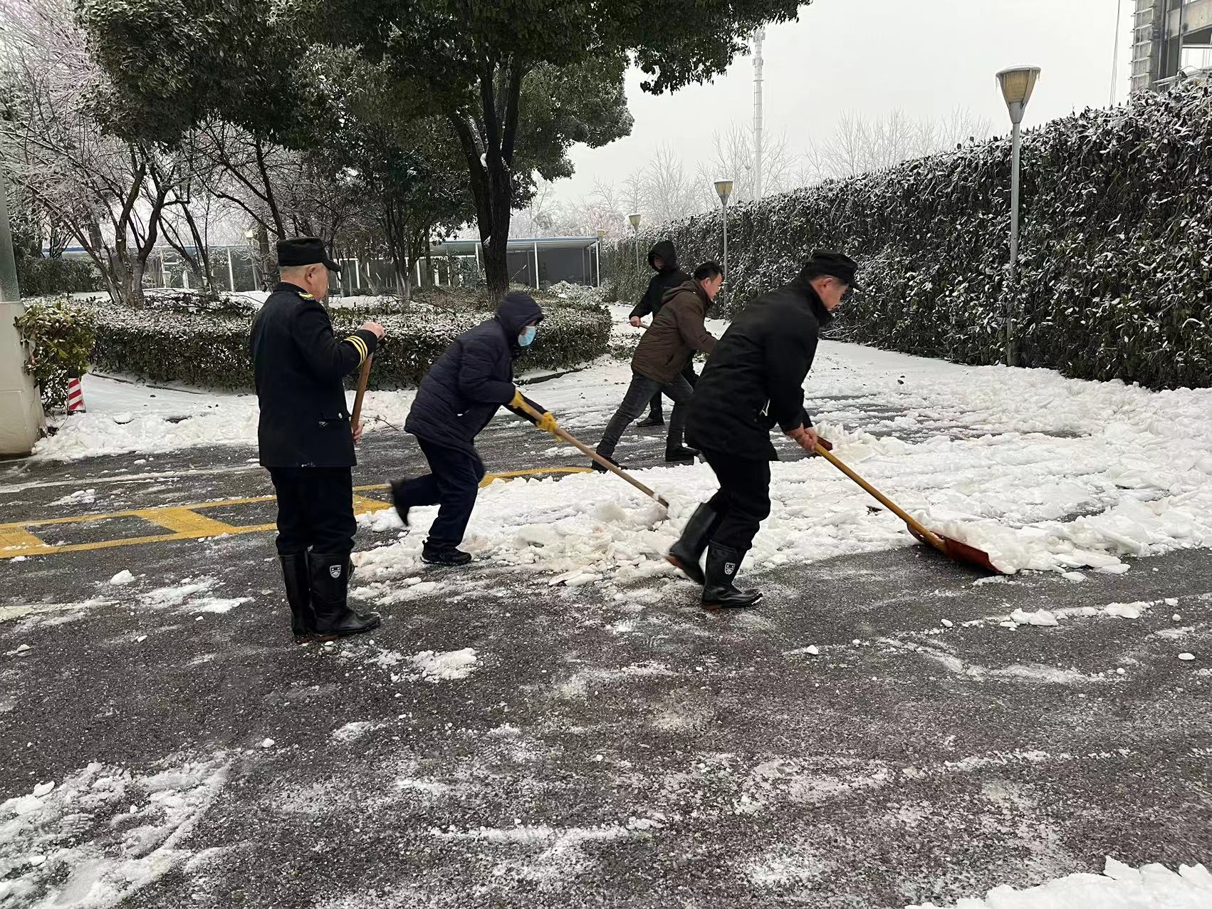 二是铲雪破冰保畅通,守护有“温度”。此次积雪厚重,路面结冰现象严重。为尽快消除冰冻,后勤人全员上阵,设路障、铺草垫、铲积雪,全力保障干部职工出行安全。