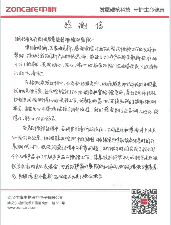 随着GB 9706.1-2020及其配套专用标准的发布实施,“武汉中旗”公司同时送达4个超声诊断类设备、3个心电监护类设备至我院开展检验检测。湖北器械院业务科快速响应企业检测需求,会同检验一室、检验三室、电磁兼容室、信息技术研究中心等科室成立专项检验小组,合理分工、密切配合,为“武汉中旗”公司提供了全方位、全链条的精准服务,仅用4个月时间加急完成7个产品的检验并出具了检验报告,与此同时,出具了首份依据FDA新发布的“医疗器械网络安全指南”的验证报告,推动该公司新产品快速上市的同时助其走向国际市场。