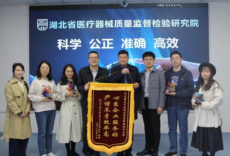 2024年3月29日,武汉中旗生物医疗电子有限公司(以下简称“武汉中旗”)将写有“心系企业服务好 严谨尽责效率高”的锦旗送至湖北器械院,以表达对我院优质服务和高效技术指导工作的认可与感谢。