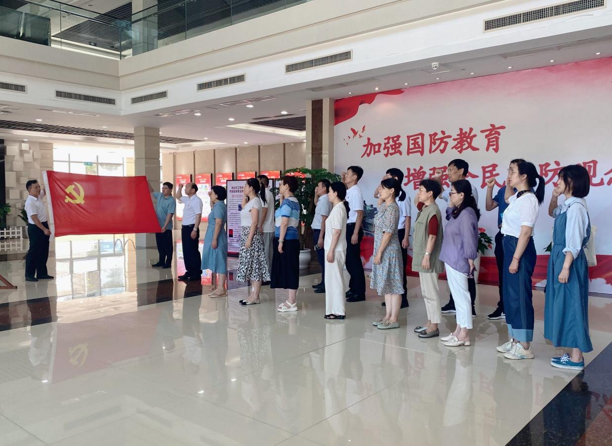 到达国防教育场馆,首先召开支部党员大会讨论接收预备党员事宜,会议按照发展党员程序要求,通过无记名投票表决方式,同意接收发展对象成为中共预备党员。随后,全体党员整齐排列,在鲜红的党旗下重温入党誓词。