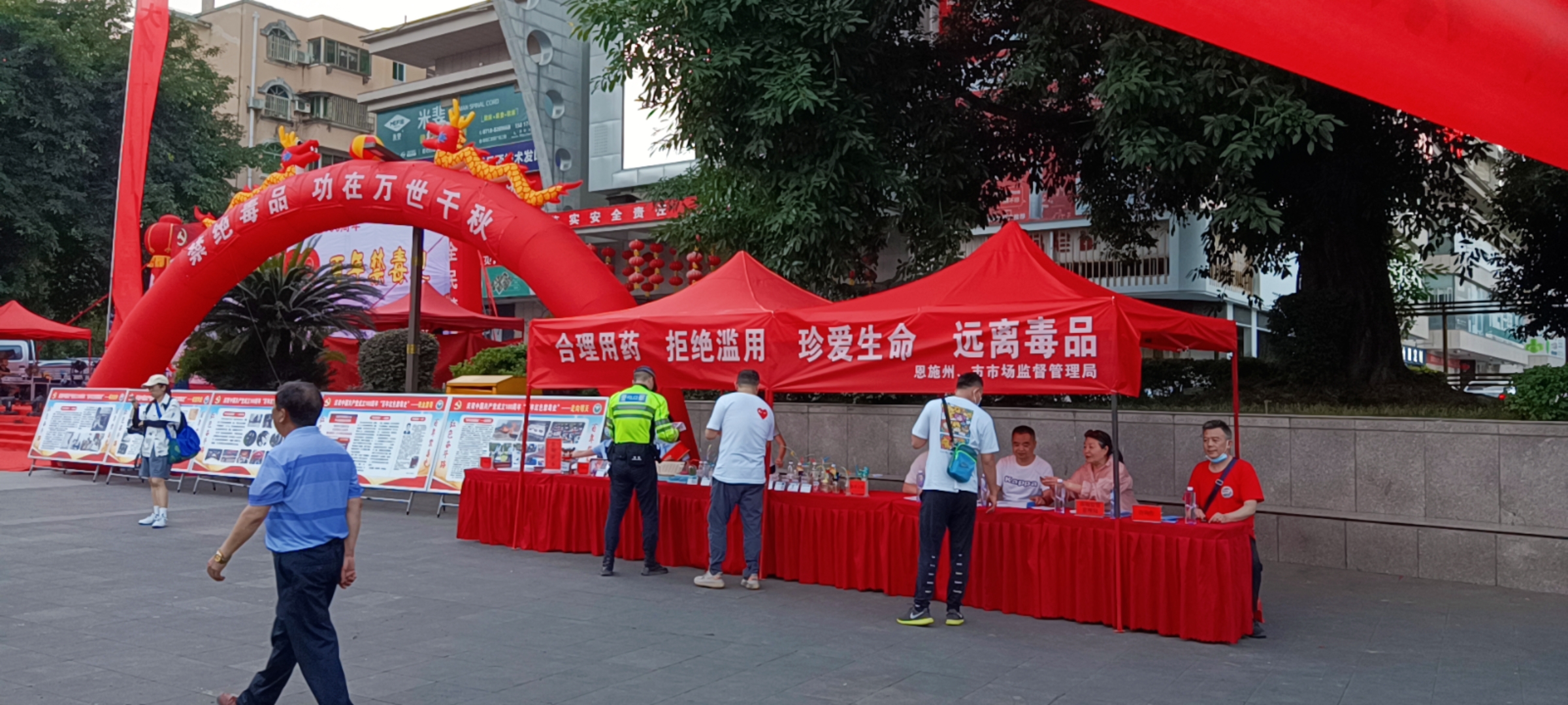 日前,恩施州市场监管局联合恩施市市场监管局在硒都广场参加禁毒委组织的科普宣传活动。现场通过悬挂横幅、发放宣传资料等方式,宣讲药物滥用的危害以及“合理用药、拒绝滥用”的知识,增强公众安全合理用药、防毒拒毒意识。